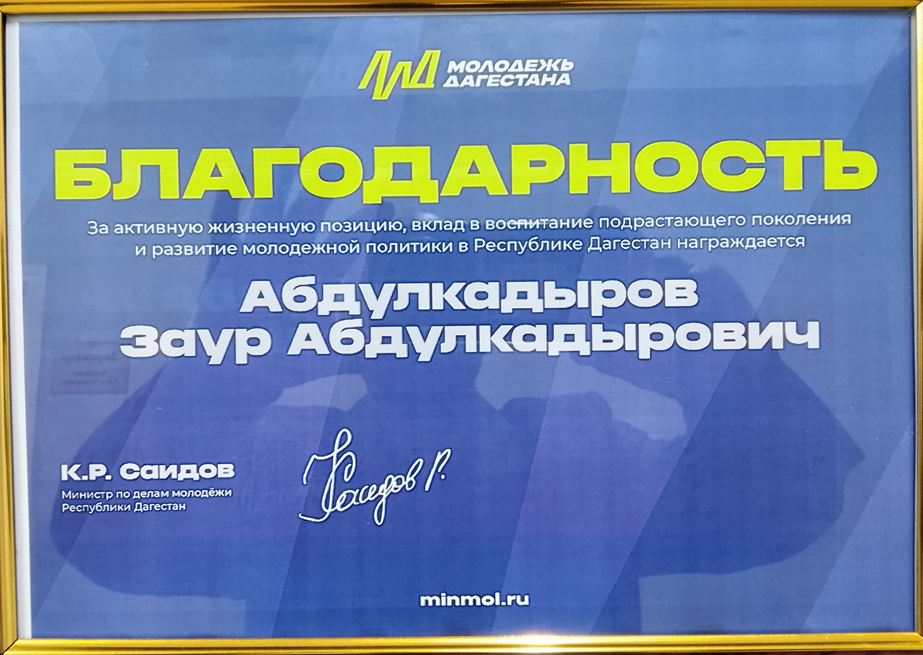 Среди награждаемых был и представитель ПОАНО "НИК", а именно советник директора - Абдулкадыров Заур Абдулкадырович - участник СВО. Он был отмечен благодарностью Министерства по делам молодежи РД за активную жизненную позицию, вклад в воспитание подрастающего поколения и развитие молодежной политики в Республике Дагестан.