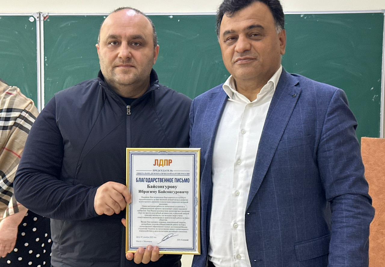 Благодарственное письмо от ЛДПР за весомый вклад в развитие волонтёрского движения и воспитание молодёжи вручил Байсонгурову Ибрагиму Байсонгуровичу координатор регионального отделения ЛДПР Гамид Абдуллаев.