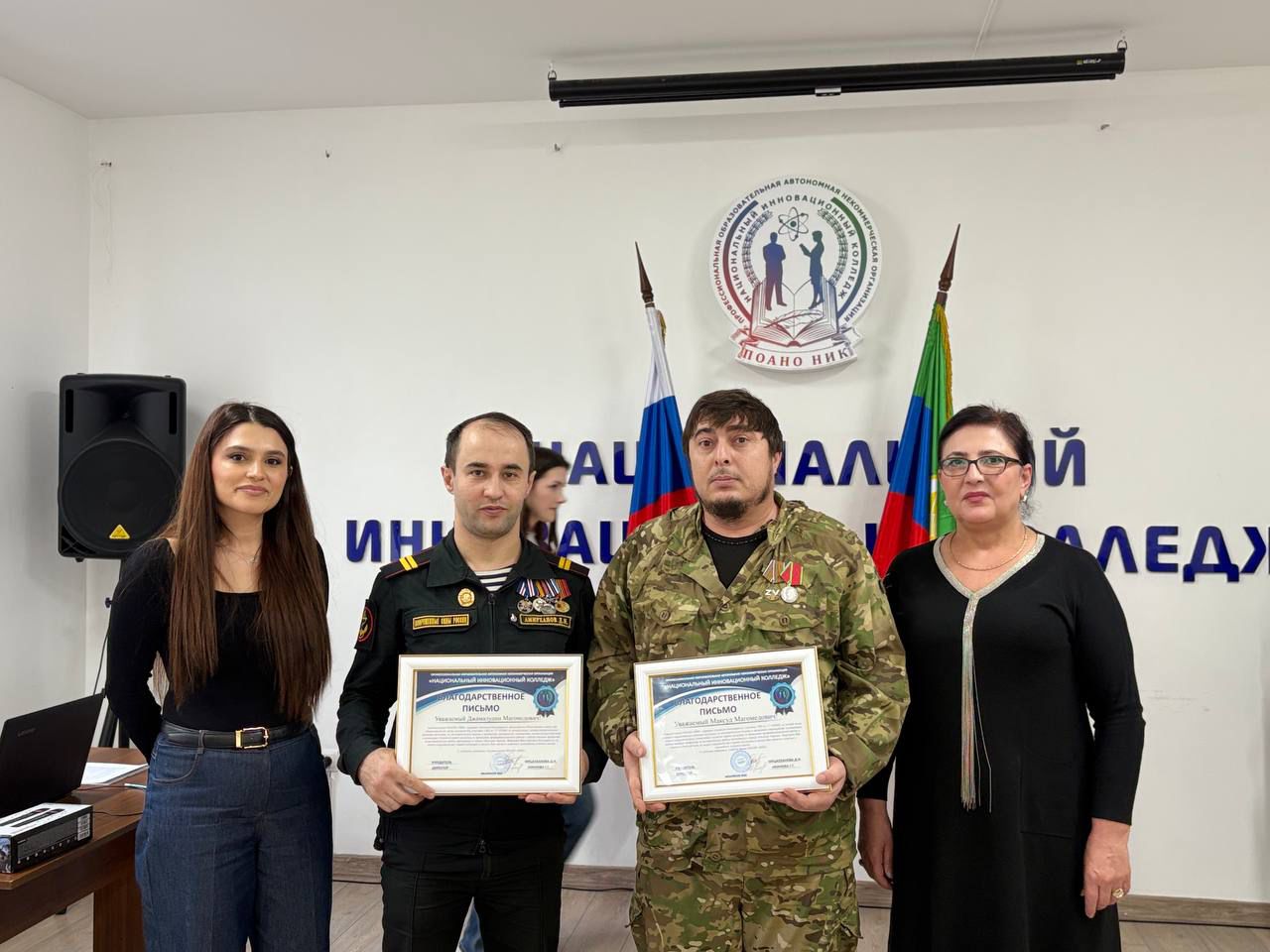 Особую значимость событию придало участие гостей, чья жизнь напрямую связана с защитой Родины: перед собравшимися выступили участник СВО от 177 ОПМП Шихалиев Максуд Магомедович и Председатель общественного совета при Министерстве по делам молодёжи РД, участник СВО от 177 ОПМП Амирханов Джамалудин Магомедович. Им от администрации колледжа были вручены благодарственные письма за активное участие в жизни колледжа, помощь в патриотическом воспитание студенческой молодежи.