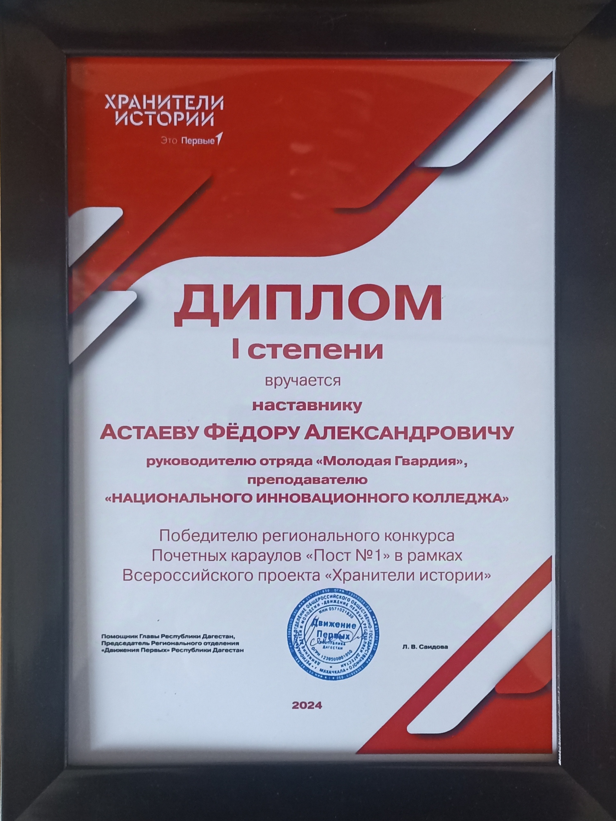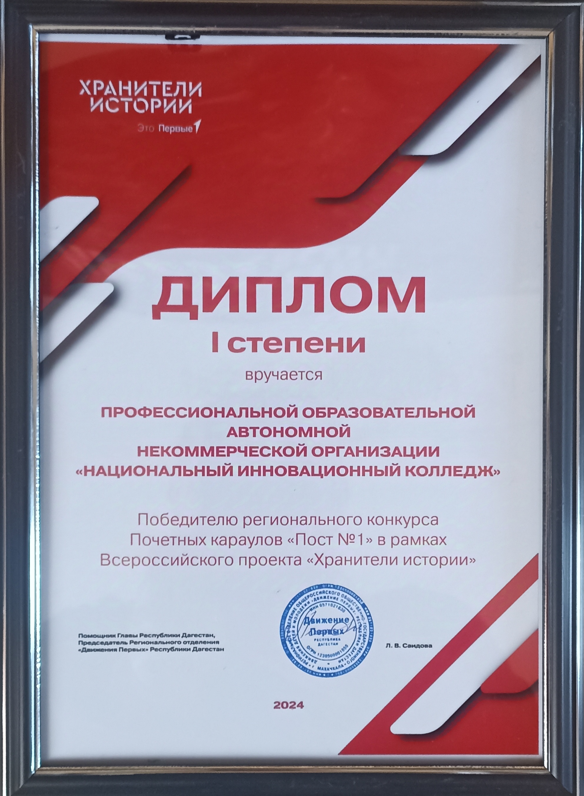 В церемонии приняла участие и команда ПОАНО "Национального инновационного колледжа". Были объявлены победители смотра-конкурса «Пост №1», который проходил у памятника Воину-освободителю в Парке Ленинского комсомола. Дипломы I степени получили воспитанники Национального инновационного колледжа и Кадетской школы-интерната «1-ый Дагестанский кадетский корпус имени генерал-полковника Трошева Г. Н.»